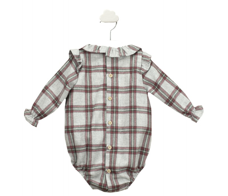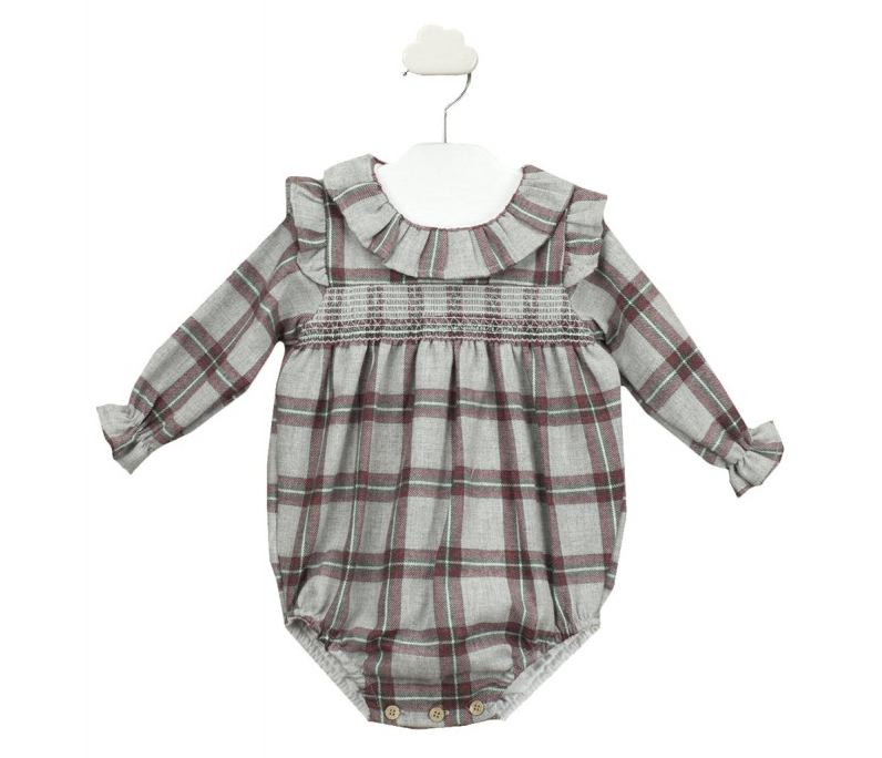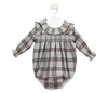 Pelele Corto a cuadros con cuello  volante en el mismo estampado. Detalle Nido de Abeja delantero.